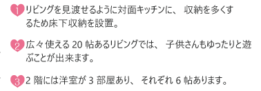 | 分譲地共通設備 | ・3ヶ所給湯工事シャワー湯沸器付・パナソニック洗面化粧台・浴槽システムバス・温水洗浄便座付トイレ・全館常時換気システム・窓サッシ(雨戸又は面格子・アミ戸付)・インターホン1ヶ所・電話配管2ヶ所・クーラー配線6ヶ所・専用回路1ヶ所・テレビ配線4ヶ所・外部水道栓1ヶ所 |